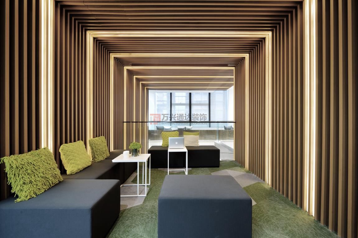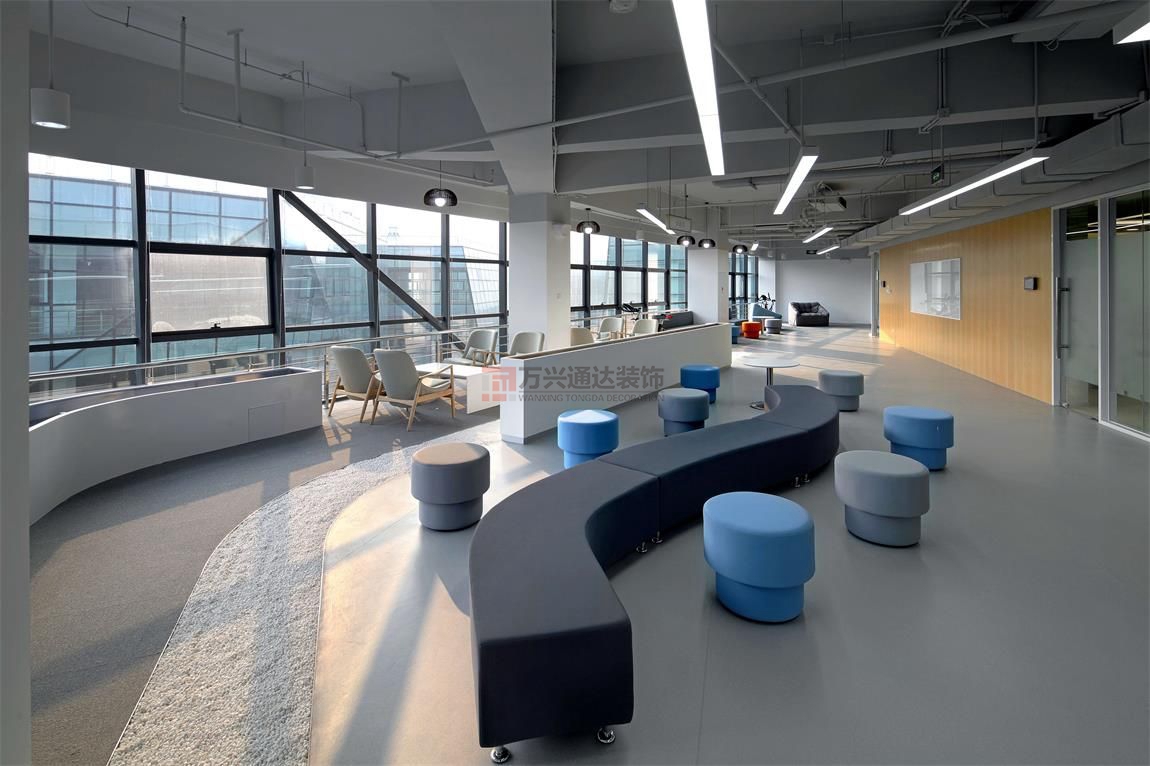 办公室装修公司案例:整体办公空间设计中,大气与细致并存,将设计与艺术结合。设计理念: 室内设计元素均交织凝聚于行云流水的曲线流动空间,设计表现形式不受拘束,每个空间都有自己特殊的弧度,致力于搭建“创新+智能+生态”的办公环境。
